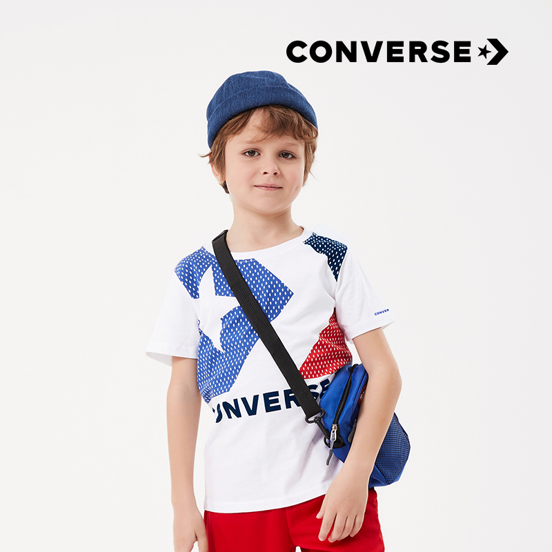 converse童鞋旗舰店Converse匡威童装男童年夏季中大童打底衫纯棉儿童短袖T恤CONVERSE标志印花搭配撞色设计具有时尚感